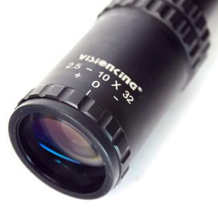 The Visionking 2.5-10x32 rifle scope has compact body design,long eye relief,super wide angle,trajectory lock, side illumination, glass-etched Mil-dot, perfect for hunting. Shock proof, Water Proof and Fog Proof (Nitrogen Purged), high-durability aluminum alloy in black matte. Objective lens:32mm Field of View:7.8°~ 2.9° Eye Relief (inch):4.4-3.75 Finish:Matte black Battery:CR2032 3V(No include) Tube Diameter:30MM Parallax:+0.22SD ~ -0.22SD Weight:860g Shockresistant:1800G